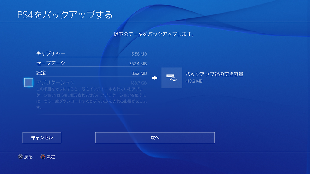 既存のバックアップをするにはUSBストレージ機器が必要になるため事前に準備をしておこう。容量はインストールされているゲームの数、キャプチャの数等に依存するので事前に確認しよう。ここではゲームアプリケーションはバックアップせず、PS4のシステム再インストール後に再度ダウンロードする前提とします。